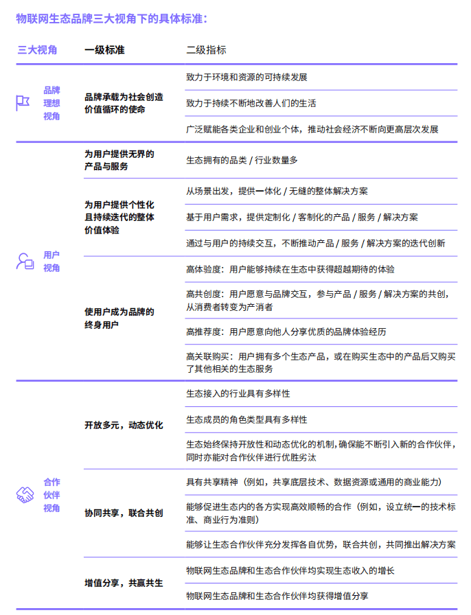 網(wǎng)絡(luò )聆聽(tīng)和案頭研究,我們終明確了物聯(lián)網(wǎng)生態(tài)品牌三大視角下的具體標準/ 指標(如后圖所示),并為每條標準 / 指標找尋到了具代表性的標桿案例。