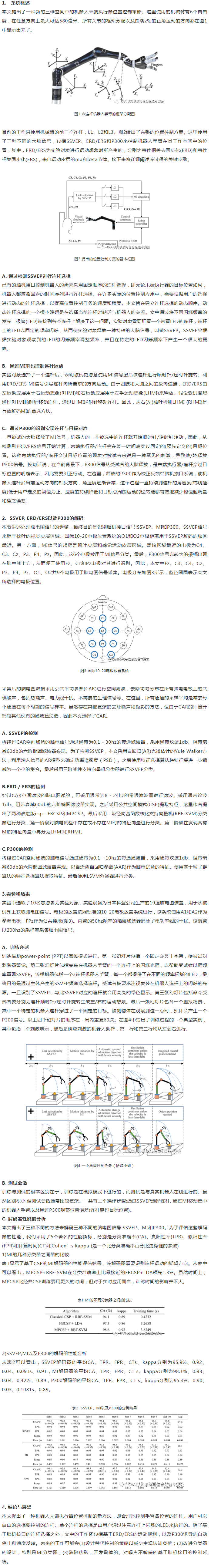 近年來(lái),腦機接口在輔助機器人和康復工程方面的應用日益廣泛,現有的為位置控制應用程序設計的腦機接口存在兩個(gè)基本限制。首先,現有的方案大多采用開(kāi)環(huán)控制,因此無(wú)法跟蹤位置誤差,導致無(wú)法采取必要的在線(xiàn)糾正措施。有一些基于腦電圖(EEG)的位置控制的工作雖然采取了閉環(huán)控制,但現這些腦誘導閉環(huán)位置控制方案采用的是固定順序的連桿選擇規則,這往往造成瓶頸,阻礙了有效的控制。其次,現有的腦誘導位置控制器被設計成像傳統的一階系統一樣產(chǎn)生位置響應,導致較大的穩態(tài)誤差。文中通過(guò)穩態(tài)視覺(jué)誘發(fā)電位(SSVEP)實(shí)現任意的選擇連桿以達到有效控制,并生成位置控制系統的二階響應,逐步減少過(guò)射/欠射,以減少穩態(tài)誤差,從而克服了上述兩個(gè)限制。文中還提出了利用運動(dòng)想象(MI)和P300信號來(lái)設計混合腦機接口系統,通過(guò)在位置誤差的零交叉處使用速度反轉來(lái)逐漸減少誤差裕度。
