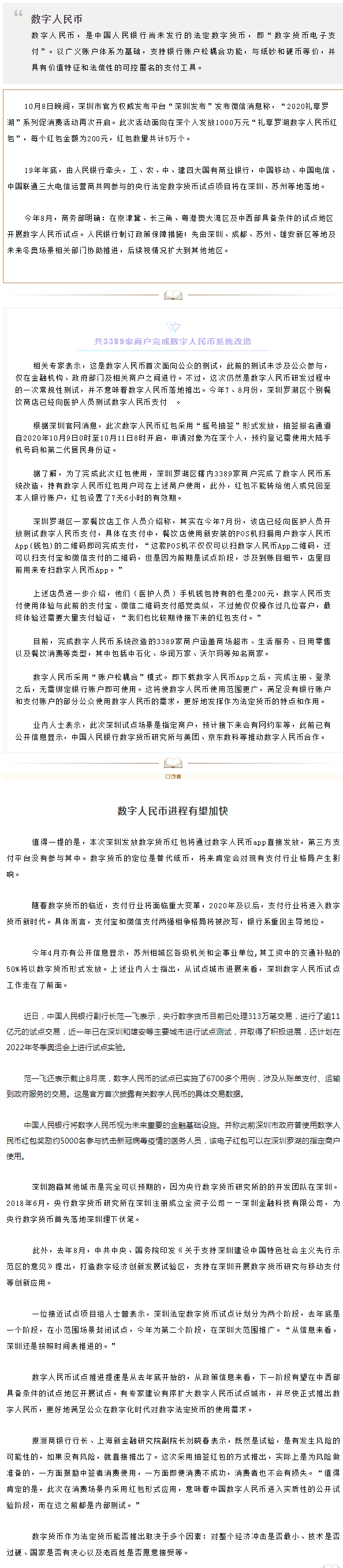 方案要求在中國人民銀行數字貨幣研究所深圳下屬機構的基礎上成立金融科技創(chuàng )新平臺。支持開(kāi)展數字人民幣內部封閉試點(diǎn)測試,推動(dòng)數字人民幣的研發(fā)應用和國際合作