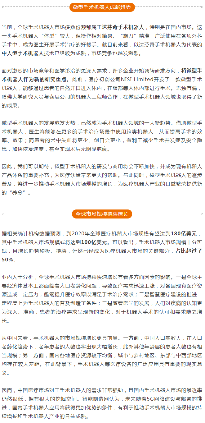 傳統的手術(shù)方式存在著(zhù)準確度、耗費時(shí)長(cháng)、視野角度等多方面問(wèn)題,而手術(shù)機器人的應用可以很好地解決上述難點(diǎn)。通過(guò)手術(shù)機器人來(lái)輔助進(jìn)行手術(shù),具有準確度G、出血量少、創(chuàng )傷面小、恢復速度快等優(yōu)勢,得到了醫生、患者