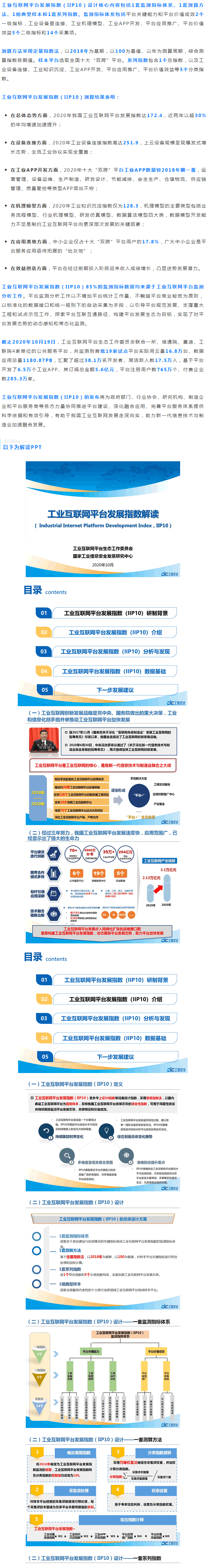 在2020年10月21日的兩化融合暨工業(yè)互聯(lián)網(wǎng)平臺大會(huì )的開(kāi)幕式上,工業(yè)互聯(lián)網(wǎng)平臺發(fā)展指數(IIP10)正式發(fā)布。該指數是受工業(yè)和信息化部信息技術(shù)發(fā)展司委托研究,由工業(yè)互聯(lián)網(wǎng)平臺生態(tài)工作委員會(huì )和國家工業(yè)信息安全發(fā)展研究中心聯(lián)合研制。