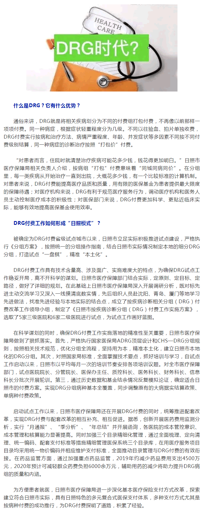 面對呼嘯而來(lái)的DRG醫保付費改革大潮,日照市充分發(fā)揮醫保在醫改中的“牛鼻子”地位、“壓艙石”作用和“指揮棒”功能,緊緊圍繞深化醫藥衛生體制改革目標,在充分考慮本市醫療保障實(shí)際情況的同時(shí)借鑒先進(jìn)地區的成功經(jīng)驗,積J探索按疾病診斷相關(guān)分組(DRG)付費改革,全力打造DRG付費工作“日照樣板”。