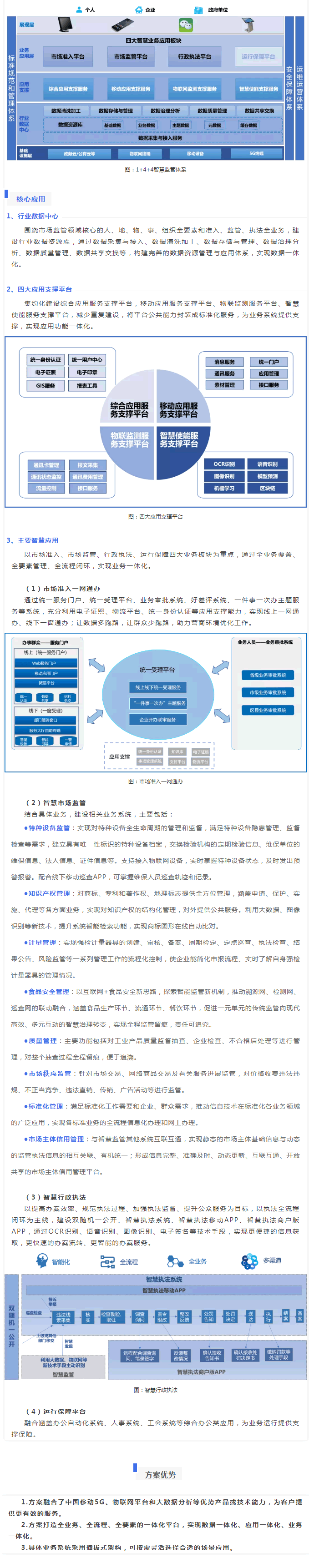 打造1+4+4智慧監管體系,即1個(gè)行業(yè)數據中心,4大應用支撐服務(wù)平臺,4大智慧應用板塊,面向個(gè)人、企業(yè)和政府單位三大用戶(hù)群體,提供多渠道、全方位、智能化的信息化服務(wù)。
