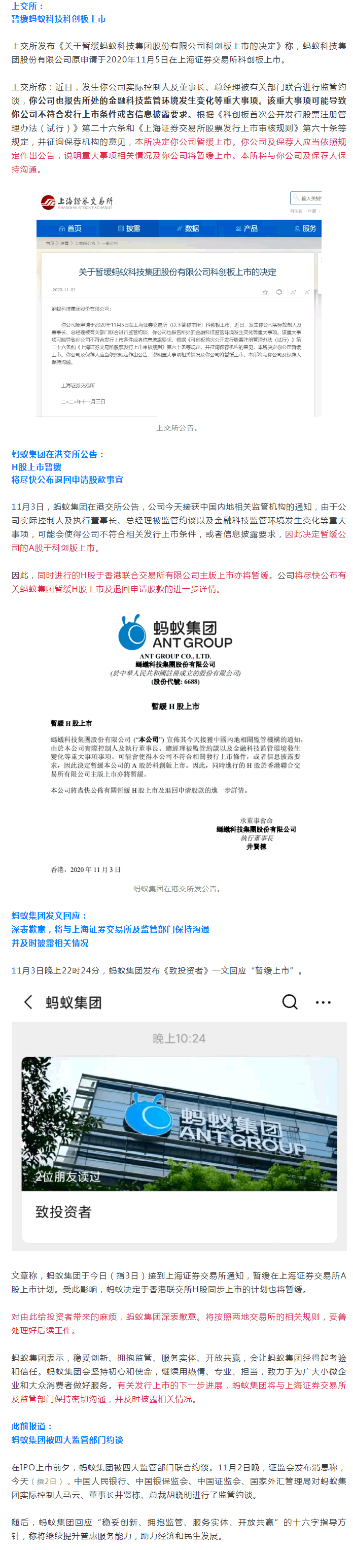 11月3日晚間,上交所公告稱(chēng),暫緩螞蟻科技集團股份有限公司科創(chuàng )板上市。隨后,螞蟻集團在港交所發(fā)布公告,同時(shí)進(jìn)行的H股于香港聯(lián)合交易所有限公司主版上市亦將暫緩。