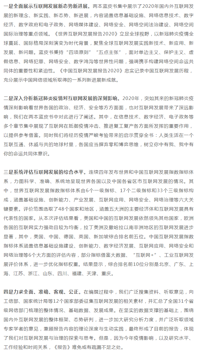 11月23日下午,《世界互聯(lián)網(wǎng)發(fā)展報告2020》《中國互聯(lián)網(wǎng)發(fā)展報告2020》在烏鎮正式發(fā)布。中國網(wǎng)絡(luò )空間研究院院長(cháng)夏學(xué)平在發(fā)布會(huì )上介紹,今年的藍皮書(shū)深入分析互聯(lián)網(wǎng)重點(diǎn)L域的新情況、新動(dòng)態(tài)、新趨勢,客觀(guān)反映了2020年度世界和中國互聯(lián)網(wǎng)發(fā)展成就、發(fā)展現狀和發(fā)展趨勢。