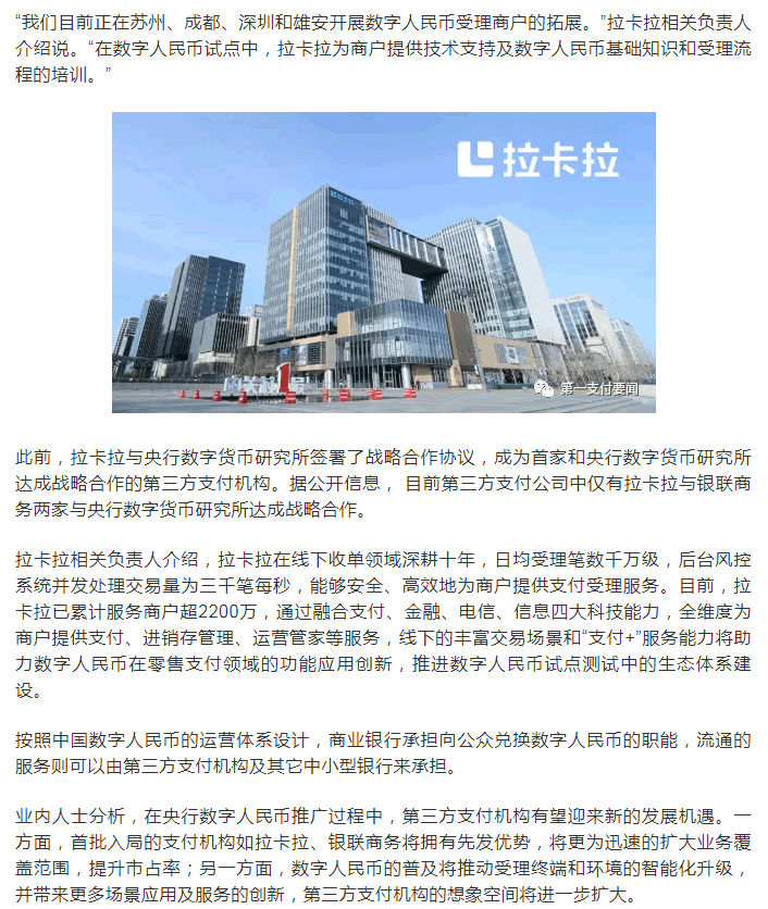 據了解,作為首家開(kāi)通數字人民幣受理服務(wù)的支付機構,此次拉卡拉參與蘇州雙十二活動(dòng)的商戶(hù)門(mén)店數近千家,包括全國知名連鎖藥店,商超,化妝品店,餐飲店,酒店,連鎖美甲店,汽配店等。此次蘇州數字人民幣消費紅包測試支持掃一掃、碰一碰(雙離線(xiàn))等非接觸支付方式。