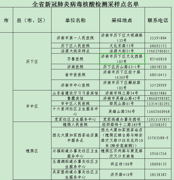 山東省衛生健康委公布全省2044家新G肺炎病毒核酸檢測采樣點(diǎn)名單,濟南市D一人民醫院 歷下區人民醫院 濼源大街采樣點(diǎn) 齊魯醫院 濟南醫院 省中醫醫院 濟南市中心醫院