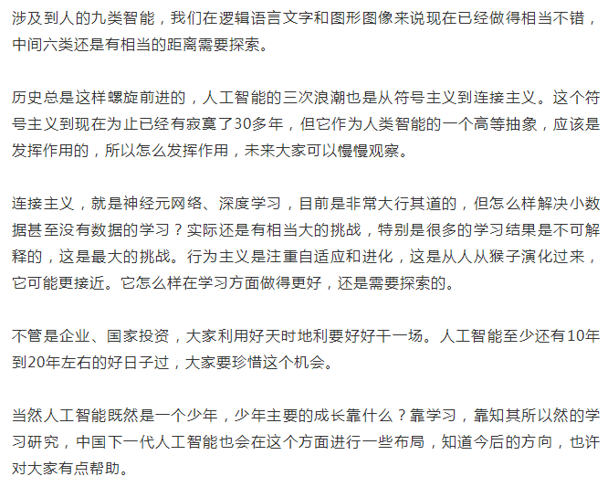 第三個(gè)是跨媒體智能,要把聲音、圖像、文字、自然語(yǔ)言所有這些東西聯(lián)結在一起來(lái)研究智能,這是跨媒體智能未來(lái)所希望達到的目標。