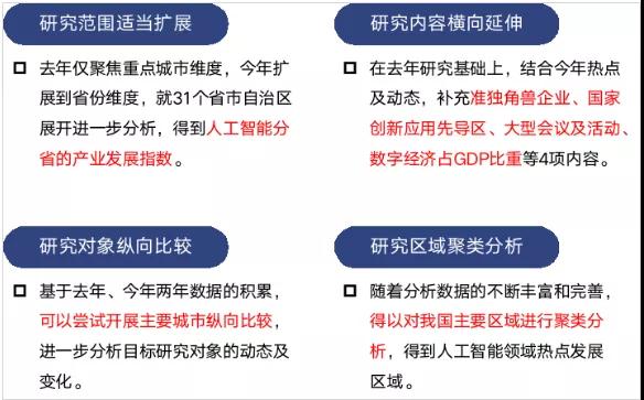 變化及亮點(diǎn)方面,今年AI指數在研究范圍、研究?jì)热、研究對象、研究區域等維度均進(jìn)行了豐富和完善,包括從僅分析市級維度擴展到省級維度、增加國家創(chuàng )新應用先導區等指標、增加年度縱向比較和區域聚類(lèi)分析等,可以說(shuō)亮點(diǎn)紛呈。