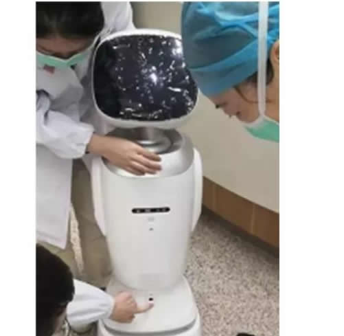 輪式移動(dòng)機器人,可在無(wú)接觸情況下查看病人電子病歷,調取檢查報告;同時(shí)具有安撫病患情緒、心理疏導等功能。