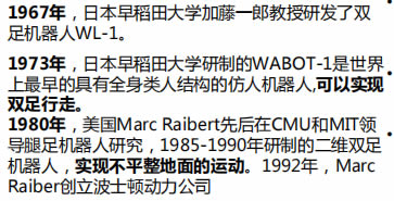 • D一階段:以早稻田大學(xué)仿人機器人為代表的早期發(fā)展階段;