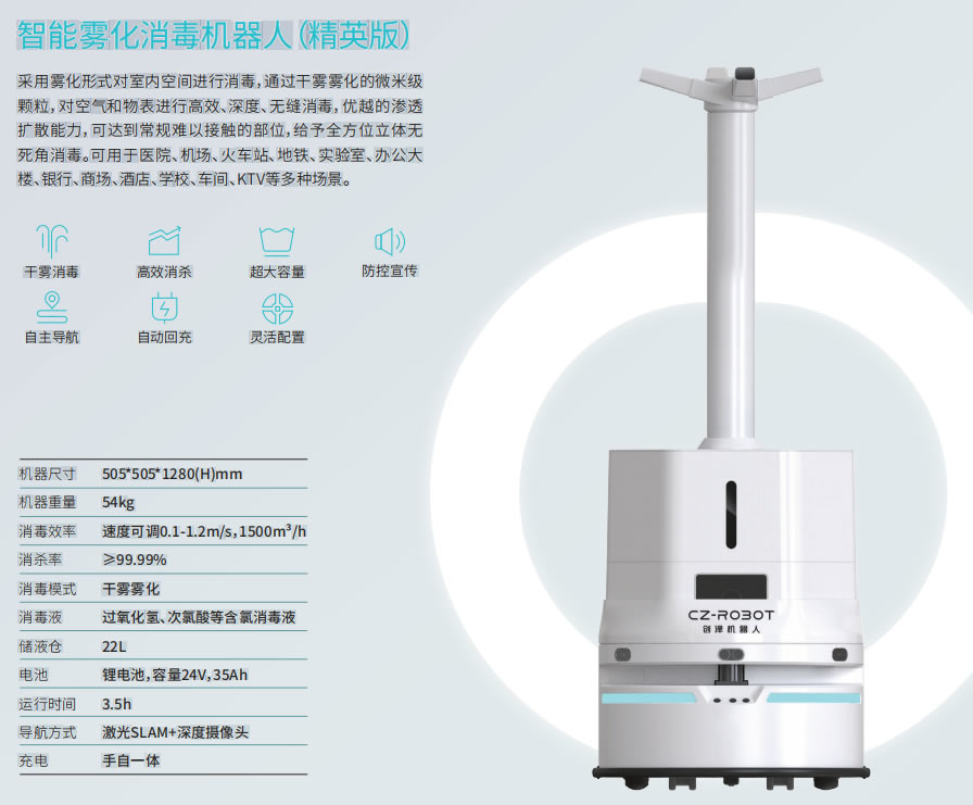 所以,創(chuàng )澤機器人基于自身輪式機器人底盤(pán)的優(yōu)勢,打造了一款霧化消毒機器人。
