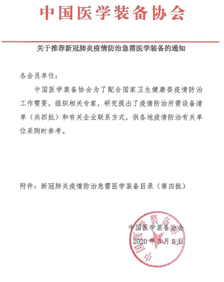 中國醫學(xué)裝備協(xié)會(huì )為了配合國家衛生健康委疫情防治工作需要,組織相關(guān)專(zhuān)家,研究提出了疫情防治所需設備清 單(共四批)和有關(guān)企業(yè)聯(lián)系方式,供各地疫情防治有關(guān)單位采購時(shí)參考。