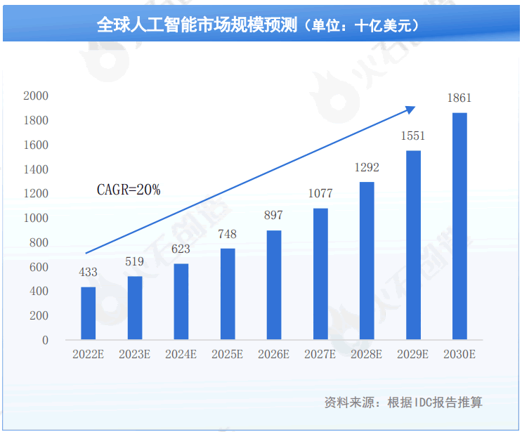 據IDC估算,2022年Al市場(chǎng)規模達到4328億美元,按同比增長(cháng)近20%推算,2030年人工智能市場(chǎng)規模將超過(guò)1.8萬(wàn)億美元。