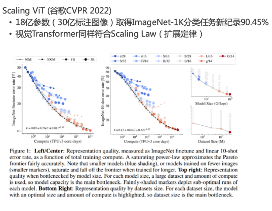 預訓練大模型是過(guò)去幾年AI發(fā)展主旋律,但是主要集中于自然語(yǔ)言處理L域。視覺(jué)L域 在2021年開(kāi)始迎來(lái)進(jìn)展。谷歌構建了一個(gè)擴展的ViT模型,擁有18億參數,并使用30億的 標注圖像進(jìn)行訓練,在ImageNet上取得了新的記錄(90.45%)。這一工作還表明,在視覺(jué)L 域上,模型同樣符合Scaling Lawo即:模型越大、性能越好。