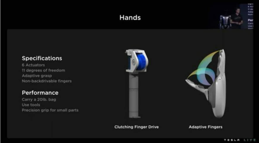 “擎天柱”全身約 50 個(gè)自由度,手指靈敏度G,能夠滿(mǎn)足多種規格的物體抓取需求。機器人單手具有 6 個(gè)執行器,11 個(gè)自由度,在對生拇指與金屬肌腱的配合 下,“擎天柱”能夠完成對不同重量和大小的物件的抓握。同時(shí),特斯拉機械手搭載能夠驅 動(dòng)手指感知物體的傳感器,幫助其識別需要抓握的物體,并在不斷的抓握過(guò)程中學(xué)習提G 機械手適應性。