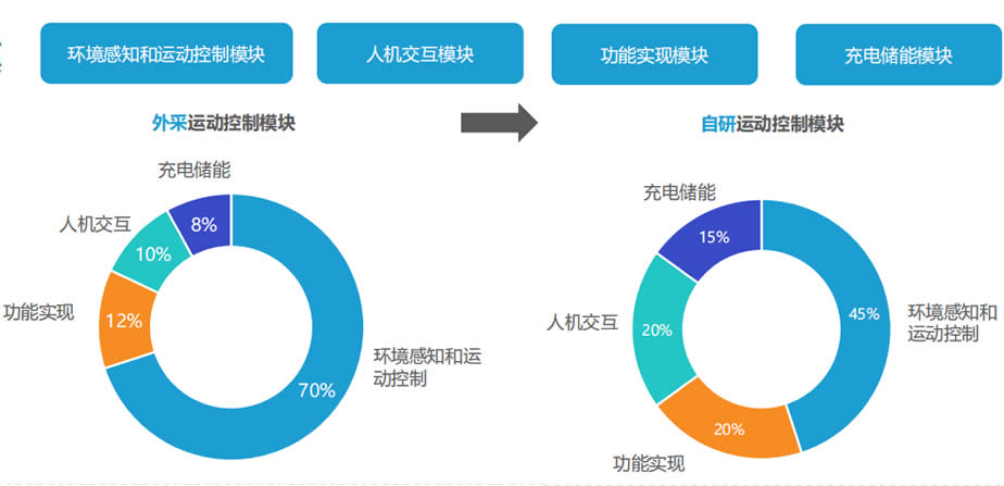 其中,人機交互模塊、功能實(shí)現模塊和充電儲能模塊基本實(shí)現自研。以往,環(huán)境感知和運動(dòng)控制模塊會(huì )有部分企業(yè)選擇外采,但隨著(zhù)技術(shù)的進(jìn)步以及成本考慮,現在多數機器人企業(yè)也實(shí)現了環(huán)境感知和運動(dòng)控制模塊的自研。