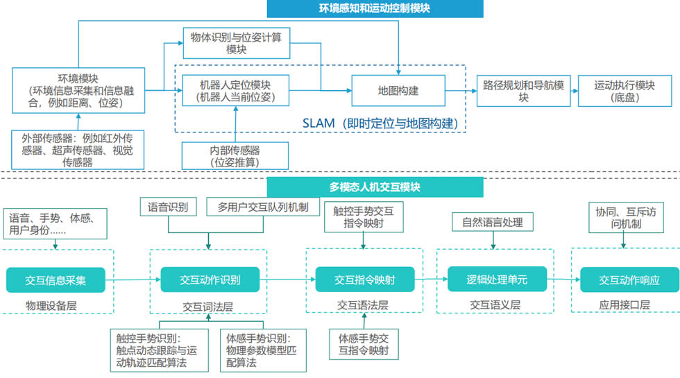 環(huán)境感知與導航是指機器人通過(guò)傳感器獲取外界環(huán)境及自身信息;運動(dòng)控制器是服務(wù)機器人行動(dòng)的執行者;人機交互技術(shù)是實(shí)現服務(wù)機器 人與人溝通的橋梁