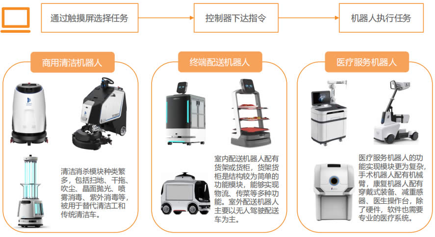 D一類(lèi):需要通過(guò)觸摸屏選擇任務(wù),控制系統下達指令才能執行任務(wù),例如清潔機器人、終端配送機器人、醫療服務(wù)機器人;