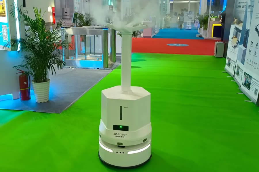 機器人將消毒液進(jìn)行超干霧化后,通過(guò)上方的四個(gè)噴口噴出,實(shí)現環(huán)境消毒功能。