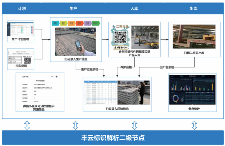 江蘇豐尚智能科技有限公司基于上述痛點(diǎn),與江蘇華晟新型建筑科技有限公司展開(kāi)合作, 開(kāi)發(fā)基于標識的生產(chǎn)質(zhì)資及倉庫管理平臺,將項目信息,構件分類(lèi),批次,生產(chǎn)工藝等提前錄 入系統,對接標識解析體統生成符合要求的標識碼。系統結合生產(chǎn)數據的任務(wù)工作蠹,按照工 程建造的構件安裝需求進(jìn)度以及工廠(chǎng)既有產(chǎn)能和生產(chǎn)流程,制定工廠(chǎng)構件生產(chǎn)計劃。按生產(chǎn) 線(xiàn)、項目、樓號、樓層、構件類(lèi)型,形成日生產(chǎn)任務(wù)單,提前規劃生產(chǎn)所需用料。生產(chǎn)過(guò)程 中,用戶(hù)可通過(guò)二維碼對構件生產(chǎn)工藝、構件信息進(jìn)行追溯、跟蹤與管理。構件生產(chǎn)完成之 后,通過(guò)出色程一掃碼步驟完成質(zhì)檢、貨運、信息錄入等多流程的實(shí)時(shí)記錄。庫位和構件信息 都可以通過(guò)PDA端程序實(shí)時(shí)查詢(xún)。方便臨檢或盤(pán)點(diǎn)人員盤(pán)點(diǎn)。該平臺部署以來(lái),幫助裝配式建 筑全生命周期信息共享和傳遞,排產(chǎn)計劃準確率提升12%,基于數據分析大幅提G產(chǎn)品質(zhì)量, 簡(jiǎn)化出入庫流程,出入庫時(shí)間縮減30%左右。