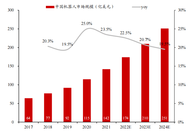 根據IFR、中國電子學(xué)會(huì )數據,預計機器人市場(chǎng)規模2024年有望達到660億美元,2020-2024年CAGR約18%。