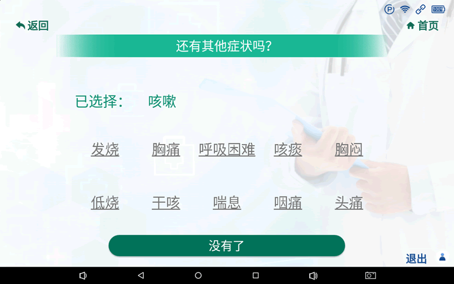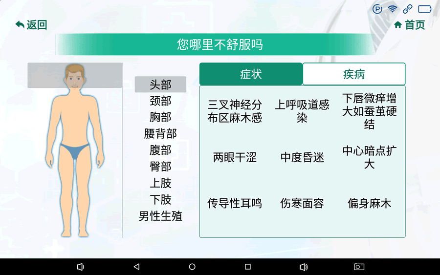 1.通過(guò)點(diǎn)擊首頁(yè)預檢分診按鈕或語(yǔ)音“預檢分診”進(jìn)入性別和年齡選擇頁(yè)面,通過(guò)點(diǎn)擊屏幕或直接語(yǔ)音如(30歲男性)選擇患者的性別和年齡,然后跳轉到癥狀或疾病選擇頁(yè)面;