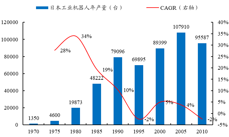 日本工業(yè)機器人年產(chǎn)量由 1970 年的 1350 臺猛增到 1980 年的 19843 臺,年均增長(cháng)率為 30.8%,處于爆發(fā)性增長(cháng)的 初級階段。