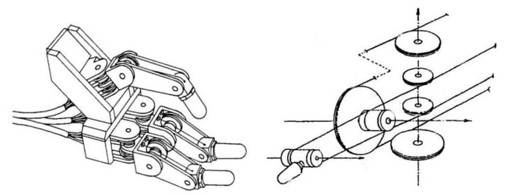 采用旋轉型驅動(dòng)的靈巧手以 Stanford/JPL 手為代表,其驅動(dòng)系統由直流電機和齒輪 減速機構組成,因而體積較大,驅動(dòng)系統只能放在手掌部位,通過(guò)腱進(jìn)行手指關(guān)節的 遠距離驅動(dòng)。