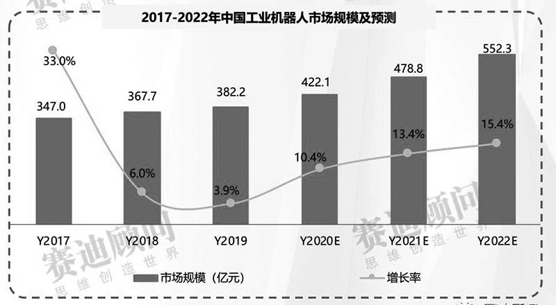 2019年,工業(yè)機器人市場(chǎng)規模受下游汽車(chē)、電子電氣等行業(yè)景氣度下滑的影響,增速較上年放緩,呈現下降趨勢,但總體市場(chǎng)規模仍然呈現穩定上升趨勢,達382.2億元,預計到2022年,工業(yè)機器人市場(chǎng)規模將進(jìn)一步增長(cháng),達到552.3億元 。