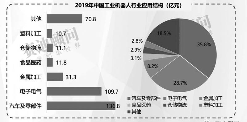 2019年,汽車(chē)及零部件在中國工業(yè)機器人市場(chǎng)的行業(yè)應用占比為35.8%;電子電氣占比為28.7%;金屬加工占比8.2%;食品醫藥占比3.1%;倉儲物流占比2.9%;塑料加工占比 2.8%;其它L域占比18.5%。