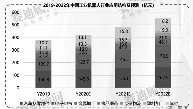 未來(lái)三年,工業(yè)機器人行業(yè)應用結構的總體格局基本保持不變。到2022年,汽車(chē)及零部件、電子電氣仍然占據大比重,隨著(zhù)制造業(yè)轉型升級進(jìn)程的不斷加速,將為金屬加工、食品醫藥、倉儲物流等應用行業(yè)帶來(lái)更大的市場(chǎng)空間。