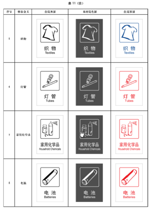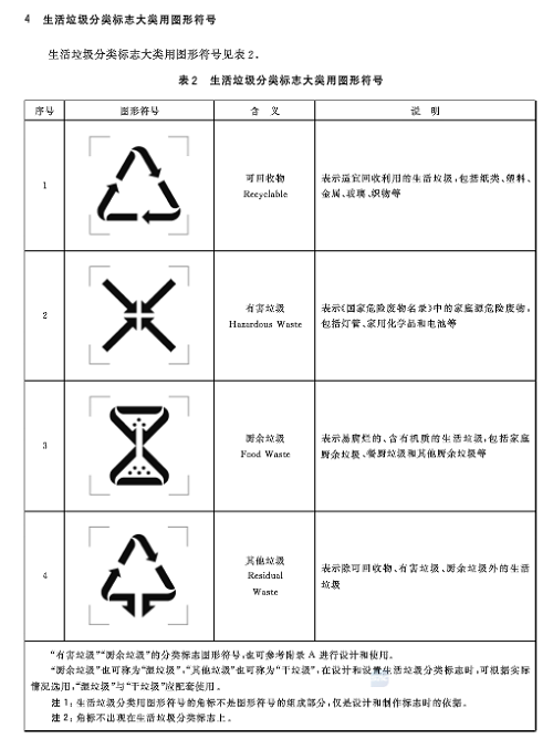 住房和城鄉建設部日前發(fā)布了《生活垃圾分類(lèi)標志》標準。本次修訂的標準,將生活垃圾類(lèi)別調整為可回收物、有害垃圾、廚余垃圾和其他垃圾4大類(lèi),并于12月1日起實(shí)施。